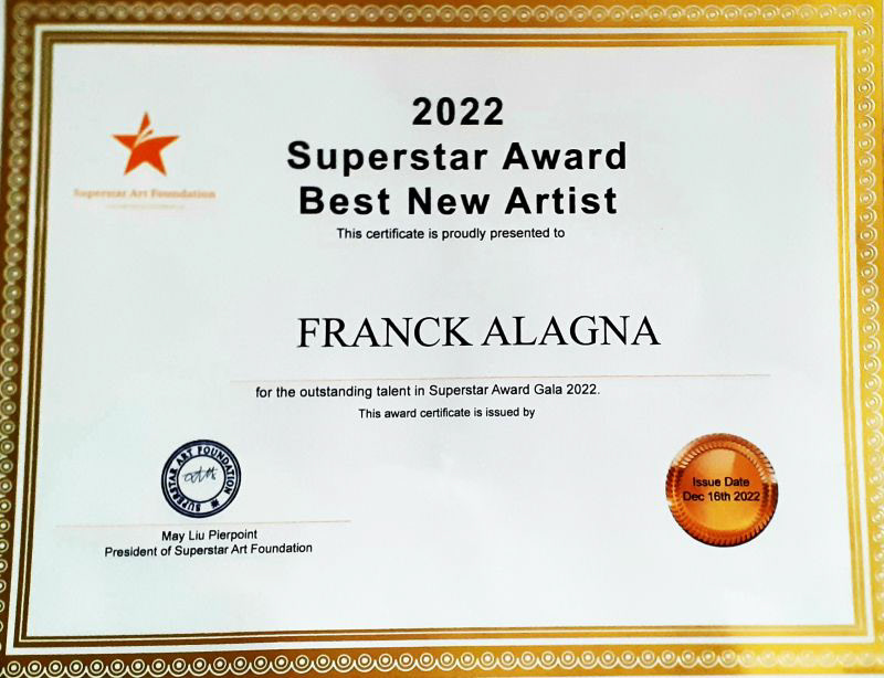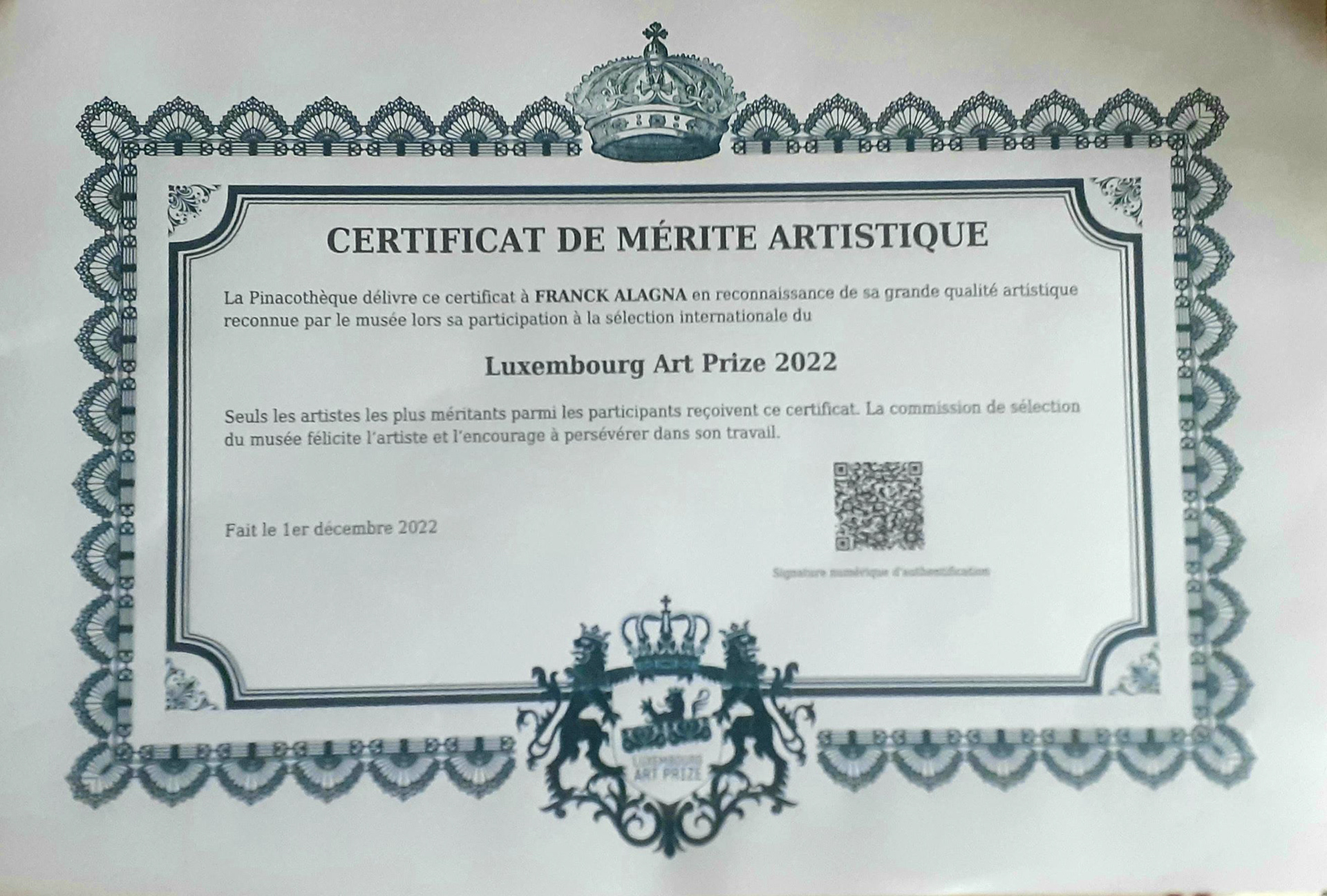 Certificat de mérite artistique délivré par la Pinacothèque à l'attention Franck ALAGNA en reconnaissance de sa grande qualité artistique reconnue par le musée lors de sa participation à la sélection Internationale du Luxembourg Art Prize 2022